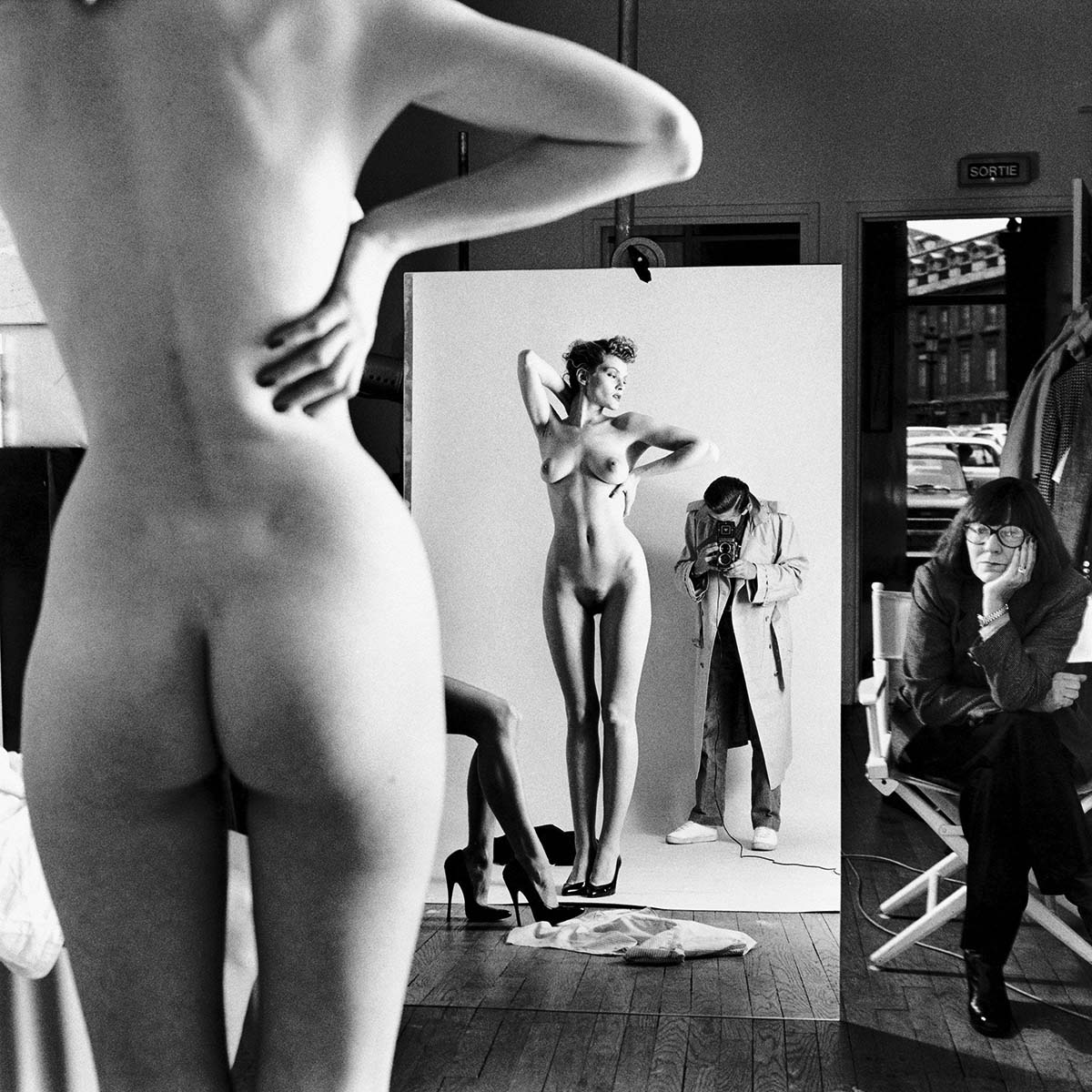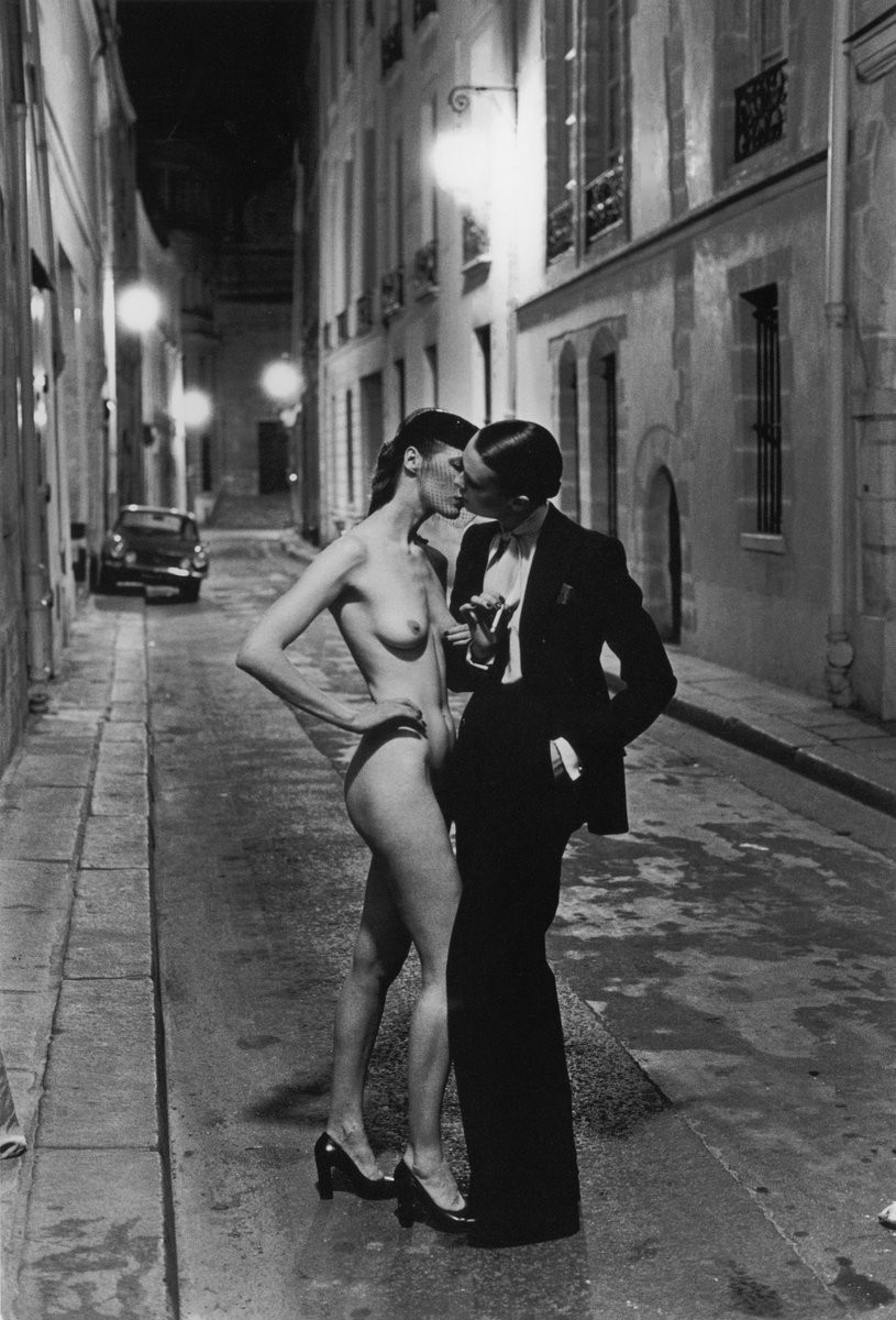 Один із знакових знімків Гельмута Ньютона для “Vogue” (Франція, 1979): модель у смокінгу від Yves Saint Laurent нахиляється до оголеної жінки в паризькому провулку. Ця провокаційна сцена – яскравий приклад фірмового стилю Ньютона, що поєднує високу моду, еротизм і гру з гендерними ролями.